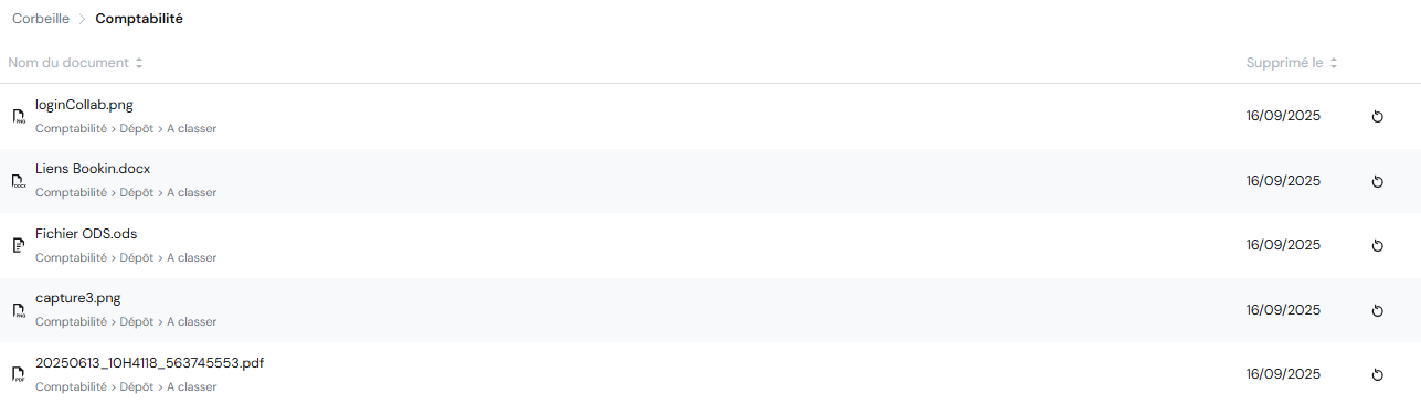 Vous serez en mesure de restaurer un document supprimé par votre client ou par vos soins, en cliquant à droite sur la flèche circulaire.