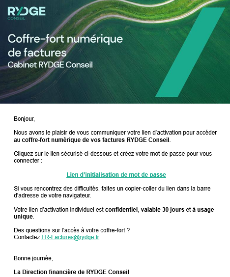 Un nouveau client du cabinet RYDGE Conseil est invité par la direction financière à créer son mot de passe pour recevoir via un coffre-fort de factures dématérialisée par email.