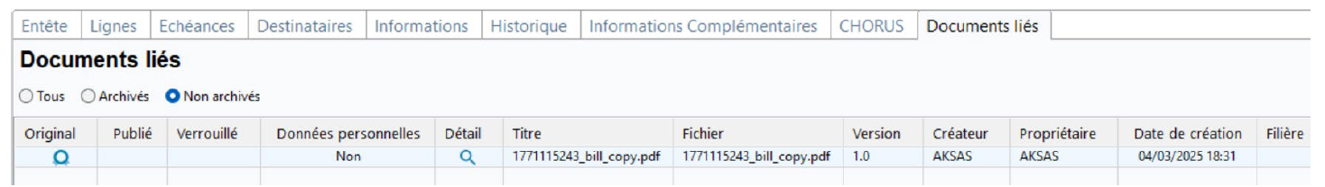 Pour les collaborateurs habilités, les duplicatas des factures non réglées au 31/12/2024 (KPMG ESC & GS et Avocats) ont été reprises dans Akuiteo, et sont accessibles sur l’onglet «Documents liés».