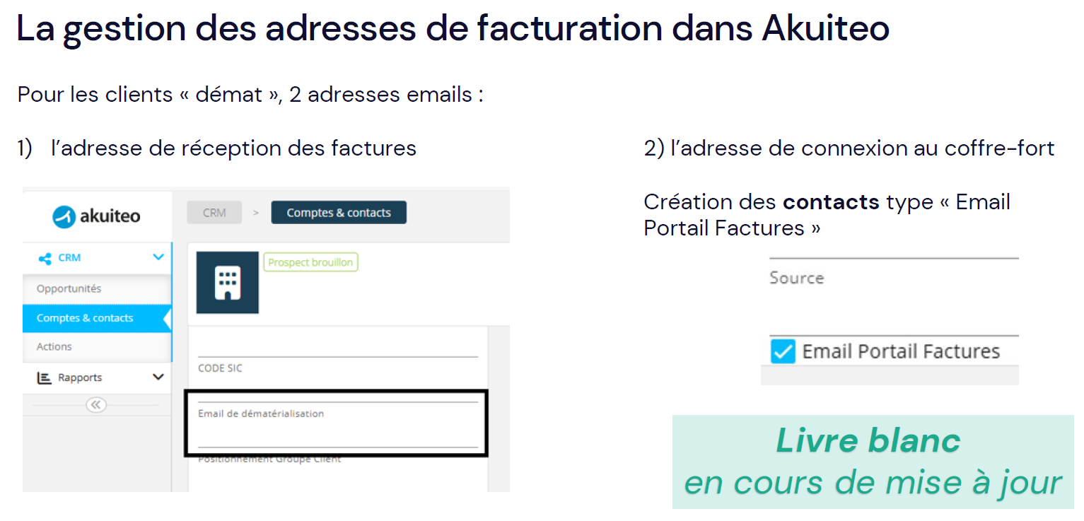 Pour les clients qui souhaitent recevoir leurs factures sous format dématérialisées, 2 adresses emails sont à renseigner dans Akuiteo.