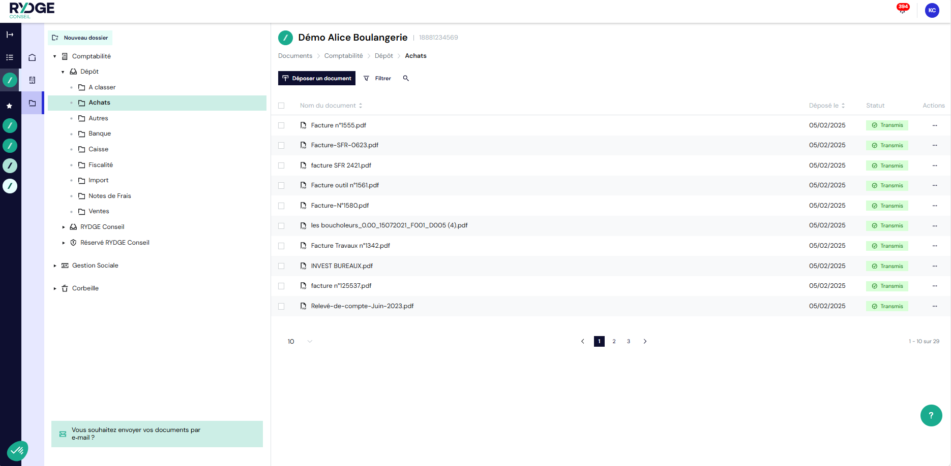 - Les parties "RYDGE Conseil" et "Réservé RYDGE Conseil" permettent à votre client de prendre connaissance des documents comptables traités par vos soins (bilan, TVA, annexe comptable, balance générale, avis et attestations fiscales, etc.).