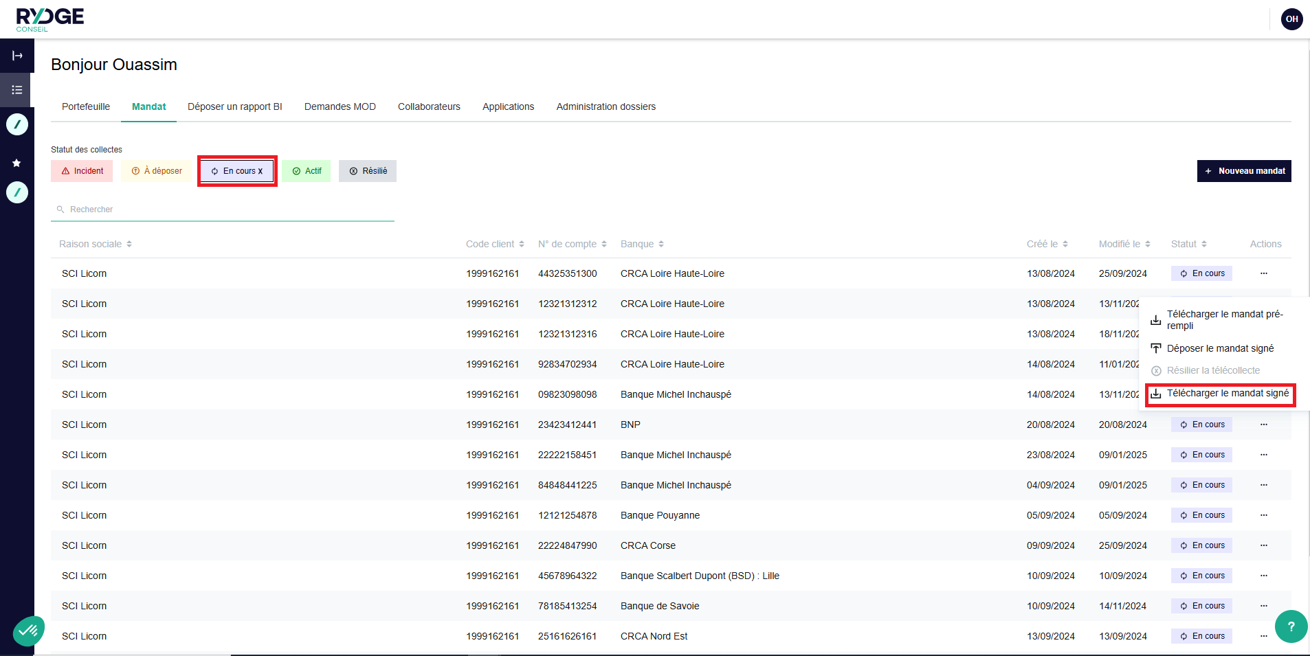 L’action de téléchargement d’un mandat bancaire signé est disponible pour le statut « En cours ».
