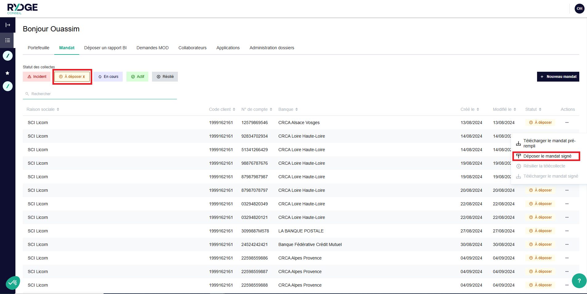 L’action de dépôt d’un mandat bancaire signé est disponible pour le statut « A déposer ».