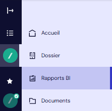 Chemin d'accès pour vérifier qu'un tableau de bord a été déposé sur le dossier de votre client : Dossier > Menu "Rapports BI"