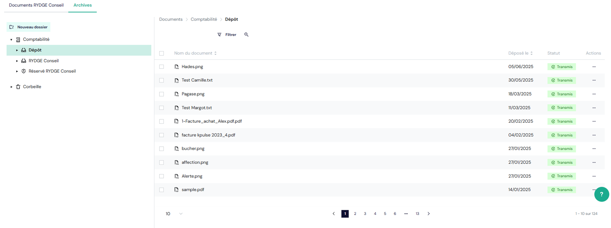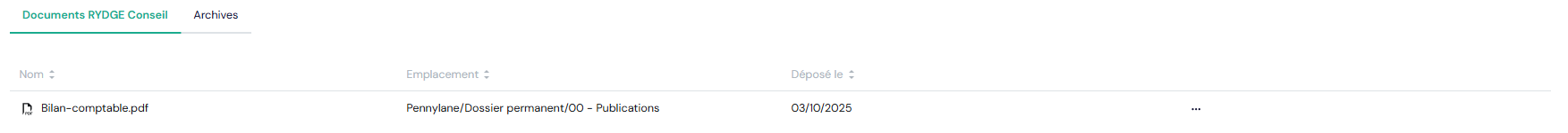 - Documents RYDGE Conseil : ce sont tous les documents déposés par vos soins sur Pennylane dans les dossiers listés ci-dessous, que nous récupérons automatiquement pour les afficher dans l'espace client.