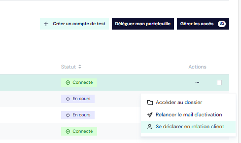 - Etape 1 : depuis la vue portefeuille, cliquez sur : "..." > "Se déclarer en relation client"
