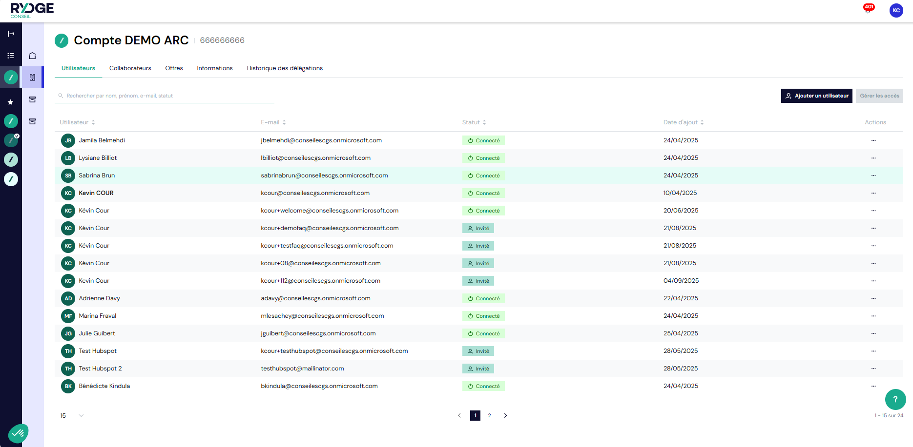 - "Invité" : l'email de création de compte RYDGE Conseil a été envoyé à votre contact, il n'a pas encore créer son compte